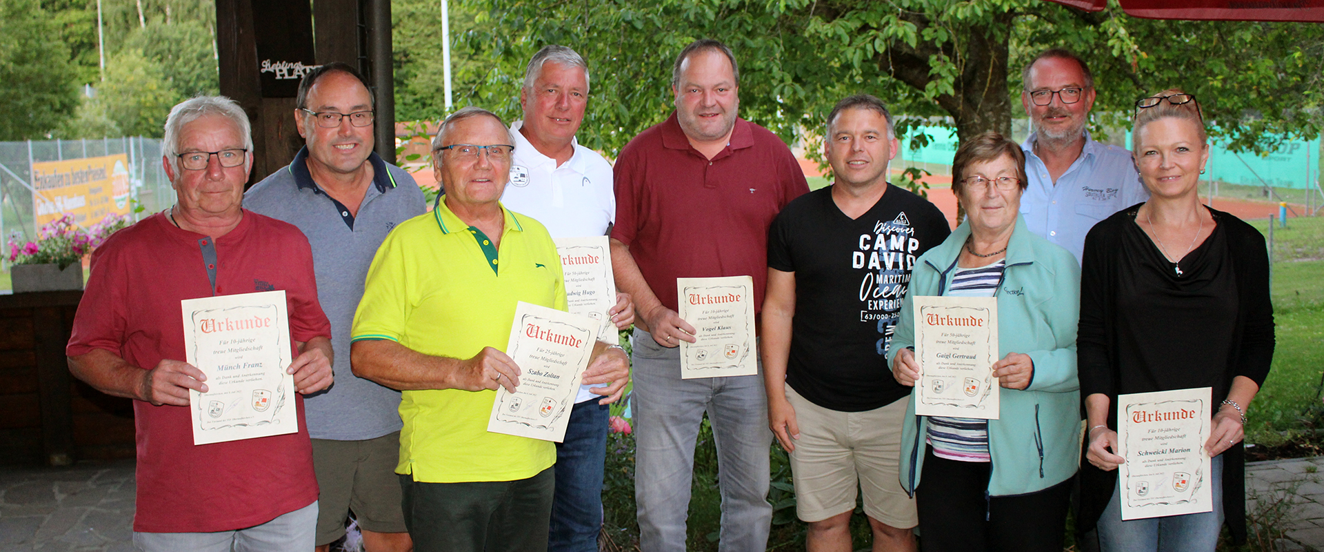 Auf dem Foto (v.l.): Franz Münch (10 Jahre), Alfred Unterhaslberger (50), Zoltan Szabo (25), Hugo Ludwig (50), Klaus Vogel (10), Konrad Geiß (1. Vorsitzender), Gertraut Gaigl (50) sowie Josef und Marion Schweickl (beide 10) nach der Ehrung.