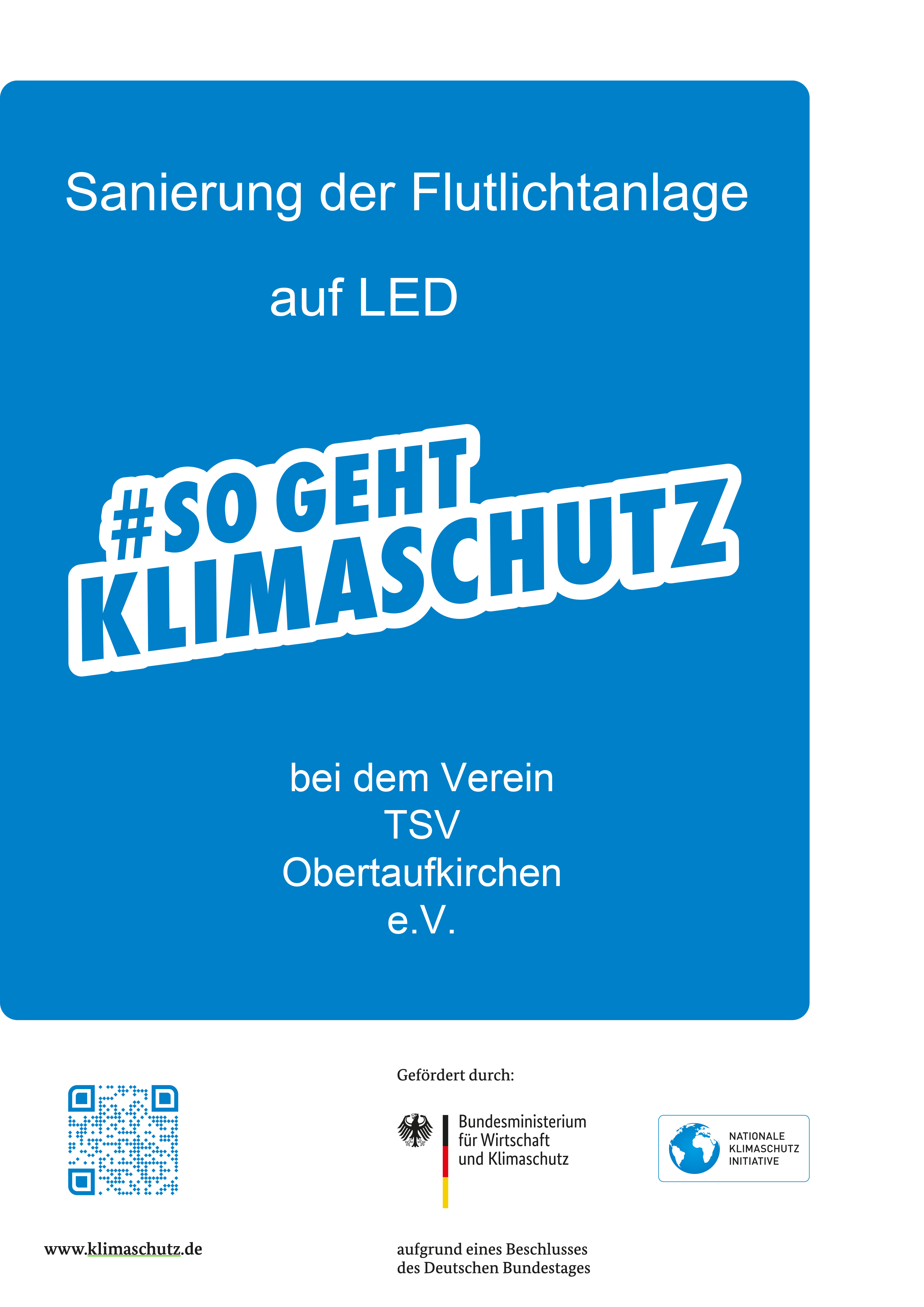 Der TSV Obertaufkirchen investiert in die Zukunft. Im Rahmen der nationalen Klimaschutzinitiative des Bundes und des BLSV wurde die Flutlichtanlage auf dem kompletten Vereinsgelände modernisiert. Mit Hilfe der Firma LEDKon GmbH wurden alle alten Halogen-Metalldampflampen durch hochmoderne LED-Strahler ersetzt.