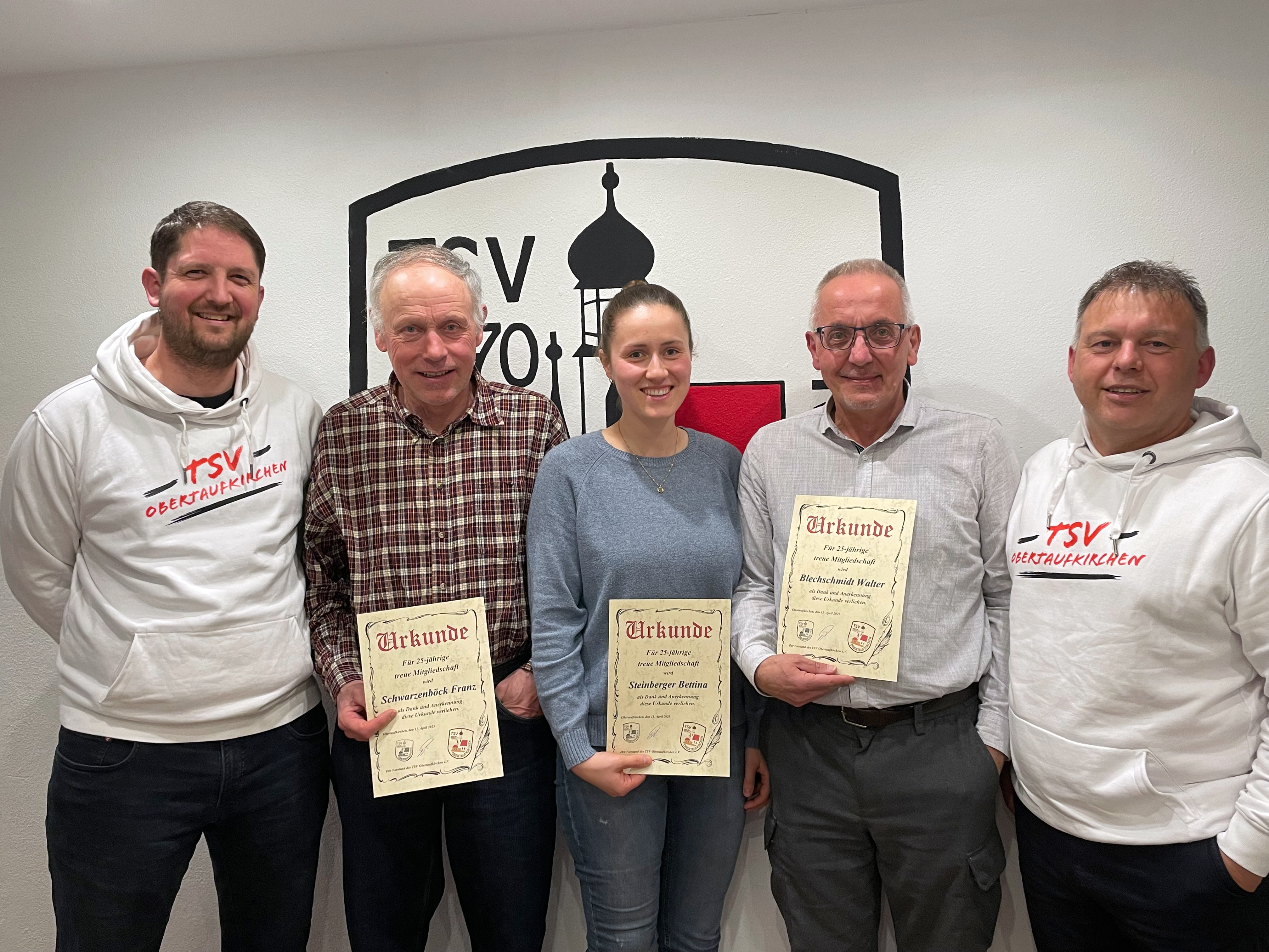 Ehrung für 25 Jahre Vereinstreue (v.l.n.r): Marius Achatz (2. Vorsitzender TSV Obertaufkirchen), Franz Schwarzenböck (25 Jahre), Bettina Steinberger (25 Jahre), Walter Blechschmidt (25 Jahre), Konrad Geiß (1. Vorsitzender TSV Obertaufkirchen)