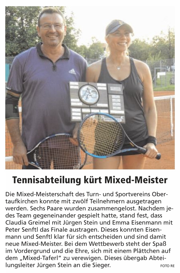 Die Vereinsmeisterschaften im Herren- und Damen-Doppel sind heuer – auch coronabedingt – ausgefallen. Umso erfreulicher war es, dass die Mixed-Meisterschaft mit 12 Teilnehmern ausgetragen werden konnte. Es musste nur Dominik Meier zur Dominique umfunktioniert werden.