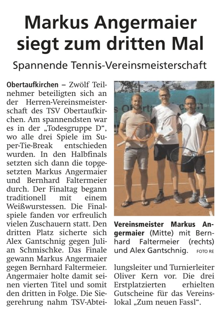 Am 22. Juli fand auf der Tennisanlage in Obertaufkirchen der Finaltag der Herren-Vereinsmeisterschaft statt. Im Endspiel setzte sich Markus Angermaier gegen Bernhard Faltermeier durch und feierte somit seinen dritten Titel in Serie.